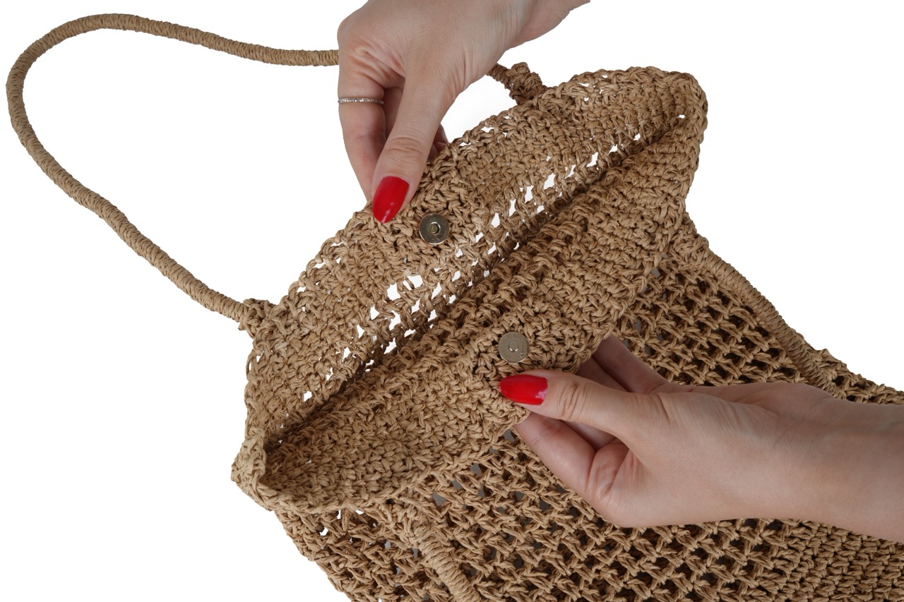 Minimalist çizgileri ve doğal dokusuyla öne çıkan el örgüsü file çanta, günlük hayatta şıklığı ve pratikliği bir arada sunar. Hafif yapısı sayesinde alışverişte, sahilde veya şehirde rahatlıkla kullanılabilir.